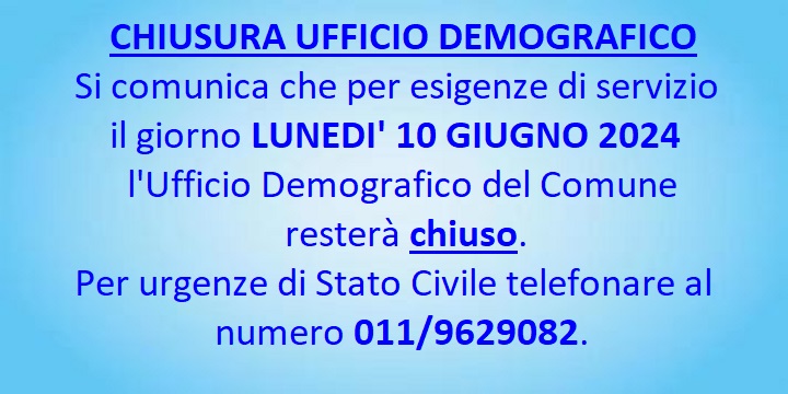 Descrizione Si comunica che per esigenze di servizio il giorno LUNEDI’ 10 GIUGNO 2024 l’Ufficio Demografico del Comune resterà CHIUSO. Per urgenze di Stato Civile telefonare al numero 011/9629082.