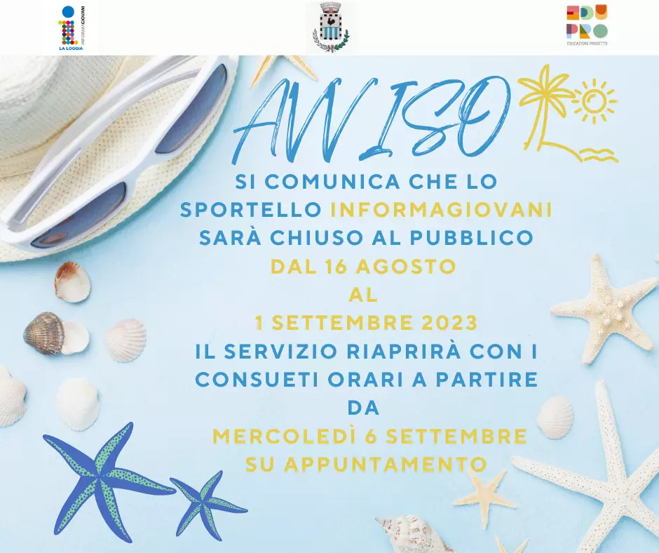 Descrizione Si avvisa l'utenza che lo Sportello Informagiovani sarà chiuso al pubblico dal 6 agosto al 1 settembre 2023. Il servizio riaprirà con i consueti orari a partire da mercoledì 6 settembre, su appuntamento.